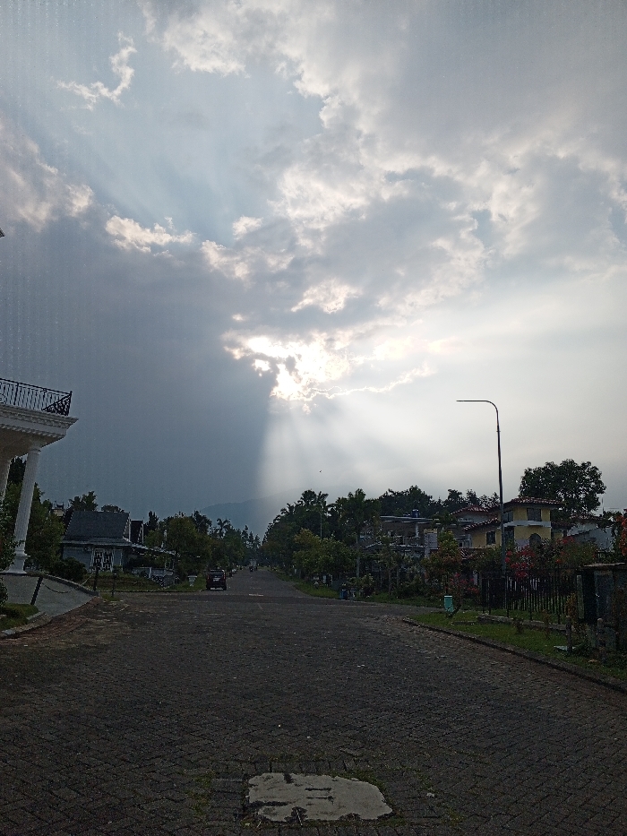 This image depicts a residential street scene in the city of Weintiapa, Liberia, observed under a partially cloudy sky with visible sunbeams. The upper two-thirds of the frame are occupied by a sky exhibiting dark grey storm clouds on the left transitioning to brighter clouds on the right, from which crepuscular rays emanate downward, indicating the sun breaking through. Atmospheric moisture or light rain streaks are visible in the upper left quadrant. The lower third of the image shows a wide, dark-paved road constructed of interlocking pavers or cobblestones, receding into the distance. A light-colored, rectangular patch is present on the road surface in the immediate foreground. On the left side of the road, the corner of a multi-story white building with classical columns and a dark, ornate metal balcony railing is prominently featured. Further down, several smaller buildings with grey roofs are partially obscured by trees. The right side of the road is lined with residential buildings, lush green trees, and shrubs. A yellow building with a red-tiled roof is visible on the mid-right. A black metal fence runs along the right-hand properties, separating them from the street. A modern street lamp with a curved arm stands on the right side of the road in the mid-ground. In the middle distance on the road, a dark-colored SUV is visible, facing away from the viewer. Further beyond, smaller vehicles, possibly motorbikes, are faintly discernible. Dense green foliage in the background suggests hills or mountains. No individuals are clearly visible.