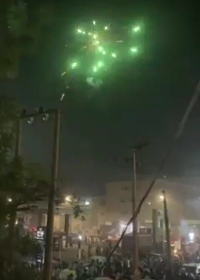 The scene is outdoors at night, where fireworks are being set off. A large crowd of people are gathered in a street with cars parked along the sides. There are light poles and trees visible. Fireworks explode in the sky, leaving trails of smoke. The camera is held by someone standing on a raised surface, offering a partial view of the scene.