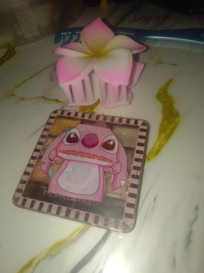 A white and pink flower-shaped hair clip sits atop a cream-colored surface with gold veining. Below, an eyeshadow palette with a pink Stitch character is visible. The palette has a black and tan striped border. The surface reflects light, and a blue object is partially visible in the background behind the hair clip. The focus is on the two items and their positioning.