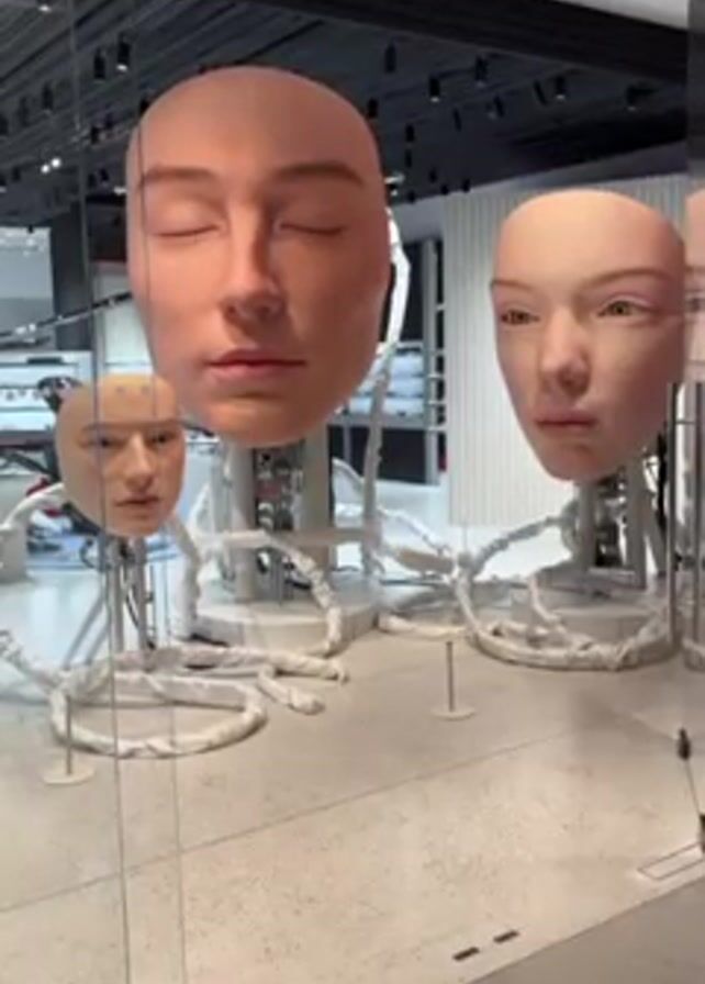 three disembodied heads, each a realistic, oversized human face on a metal stand, displayed behind a glass barrier