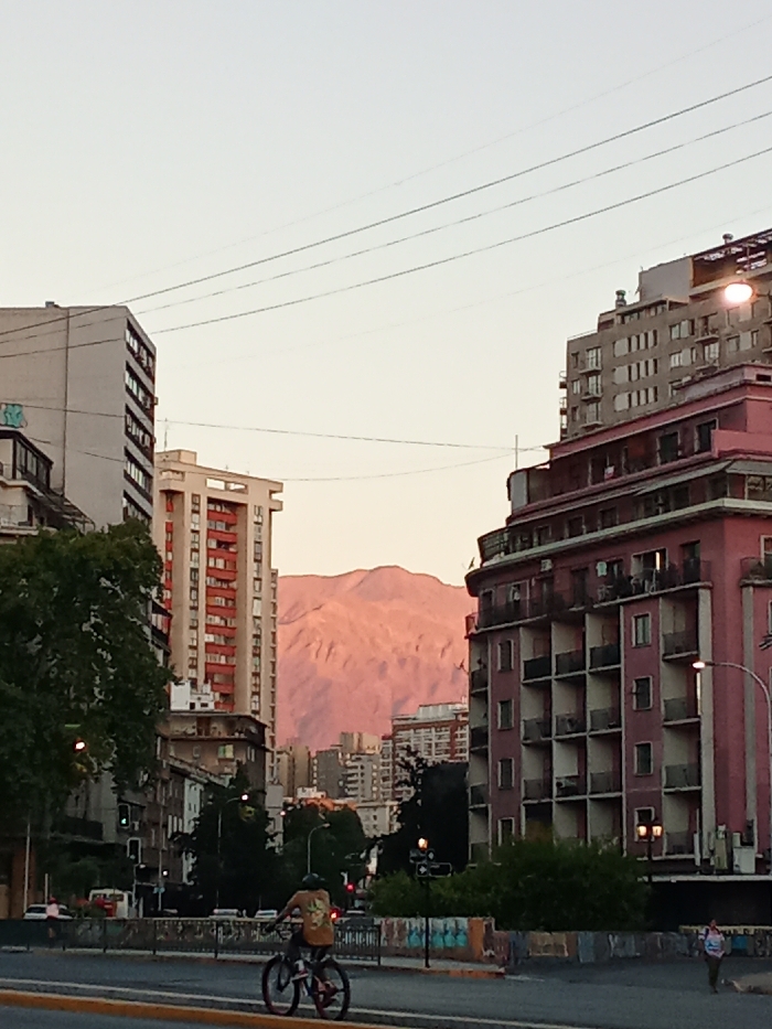 A street scene shows a cyclist riding on a road in front of buildings. In the background, a mountain range is visible. The buildings are a mix of styles and heights, with one notable pink building on the right. Power lines stretch across the top of the image. Trees and other greenery are interspersed between the buildings. The sky is light, suggesting either dawn or dusk. People can be seen walking and standing in the scene.