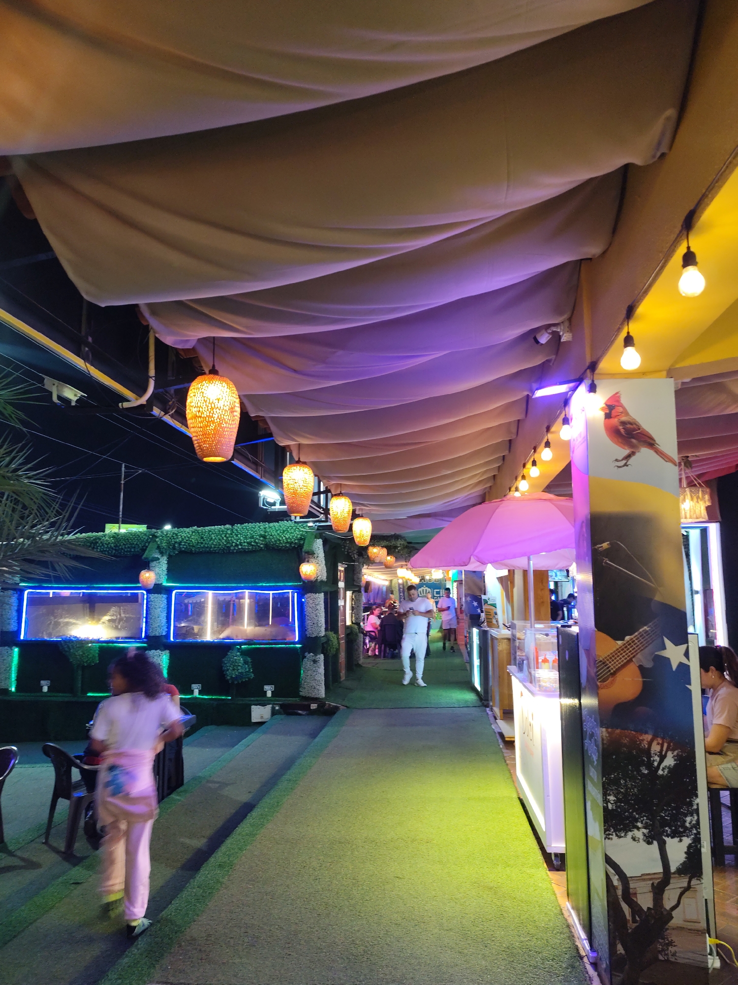 The image portrays a nighttime commercial or pedestrian walkway in Los Robles, Venezuela. An overhead canopy of light-colored, draped fabric extends across the scene, with portions illuminated by purple light. Numerous amber-colored, woven lantern-style lights are suspended from this canopy, alongside rows of exposed incandescent bulbs attached to a yellowish beam on the right. The ground surface consists of a central strip of green artificial turf, bordered by darker, possibly concrete, walkways. On the left side, a structure covered in artificial foliage features two rectangular display windows outlined with vibrant blue and green neon lighting. A dark table and chairs are positioned in the immediate left foreground. Along the right side, multiple illuminated white kiosks or vendor stalls are visible. A large, open pink umbrella stands above one of these stalls. A prominent white pillar adjacent to the stalls displays graphic imagery: a red cardinal at the top, a section resembling the Venezuelan flag with a white star, a classical guitar, and a tree silhouette. A white security camera is mounted on the overhead structure on the right. Multiple individuals are present. In the left foreground, a young person with dark, curly hair, wearing a white t-shirt and pink pants, walks away from the camera on the darker path. In the mid-ground, a male individual dressed in all white walks on the green turf, facing towards the right. Other blurred figures are visible further down the walkway. On the far right, a female with dark hair is seated at a counter or table, facing left, adjacent to the graphic pillar. The environment is brightly lit by artificial sources.