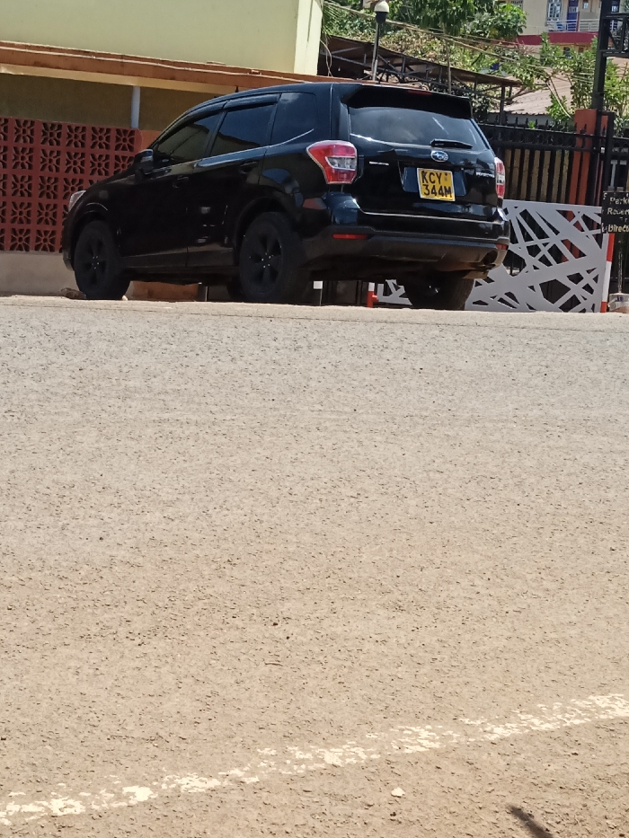 A black Subaru Forester SUV, bearing Kenyan license plate KCY 344M, is parked on a light brown, coarse paved surface, identified as a street or parking area by a faint, broken white line in the foreground