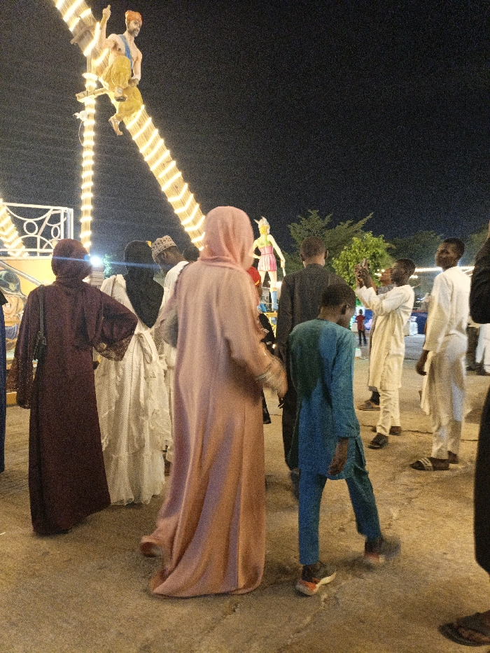 An outdoor nighttime scene shows a crowd gathered around illuminated figures. The foreground features people in traditional Muslim dress. A large, brightly lit structure with a man riding an animal atop it dominates the left side. Several men are taking photos with their phones. In the background, another lit figure with a red and white dress and headgear stands out. The overall atmosphere appears to be festive and celebratory.