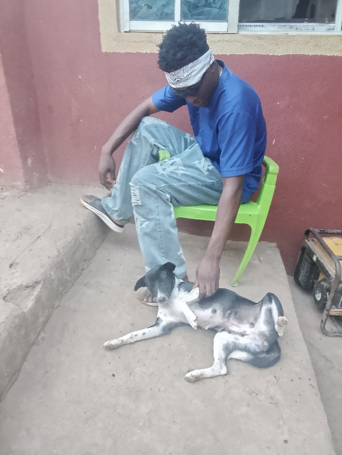 A young man in a blue shirt, light blue patterned jeans, and a bandana is seated on a lime green plastic chair outdoors. He is petting a black and white dog lying on its back on the ground. The dog has its legs in the air. Behind the man is a red wall with a white-framed window above him. To the right of the scene is a yellow and black generator. The area appears to be a concrete patio.