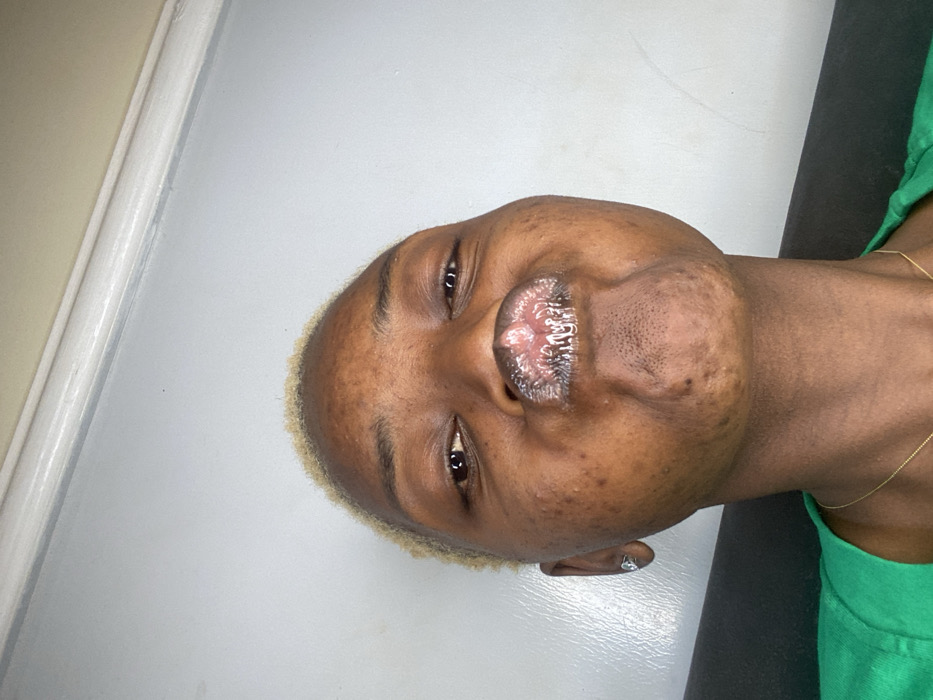 A close-up frontal portrait depicts an individual, purportedly located in Sabon Tasha, Nigeria. The subject has dark skin, short light-blonde hair, and visible facial acne. Their lips are tightly pursed forward in a pronounced pouting or "kissing" gesture, causing the cheeks to draw inward. Dark eyes are open and directed towards the viewer. A single clear-stone stud earring is visible in the left earlobe. A thin, gold-colored chain necklace is worn, resting on a green garment covering the upper chest. The background features a plain light grey wall, with a white horizontal trim or molding visible in the upper section. A dark, indistinct object is present in the lower background, behind the subject's neck and left shoulder.