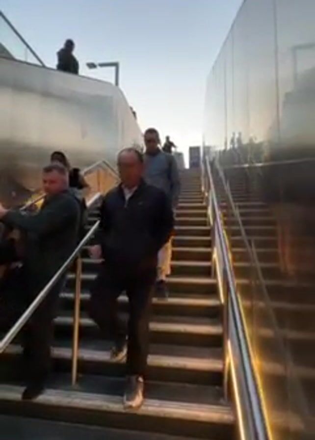 several people walking down a long outdoor staircase. The stairs have metal handrails, and the walls on either side are reflective, adding to the brightness of the scene. The sky is visible above, appearing bright and clear, suggesting it is daytime. The people are dressed casually, wearing jackets and trousers. They are walking at a normal pace, with some looking towards the camera while others are focused on the stairs. The lighting is good, and the video is stable, providing a clear view of the people and the environment.