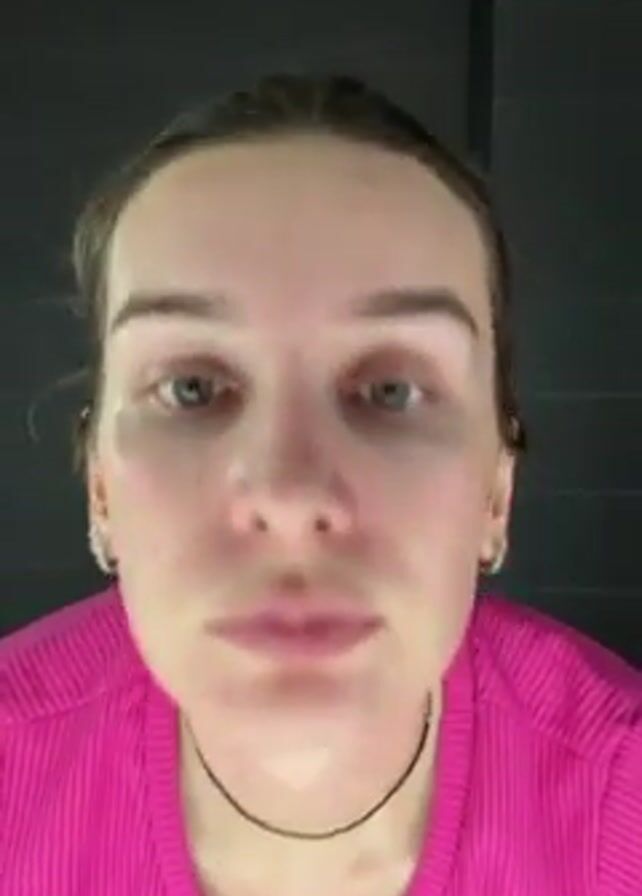 A person in a pink shirt is standing in front of a dark gray tiled wall, possibly in a bathroom. They are bending over and then lifting their head to look at the camera. They then use both hands to splash water on their face.