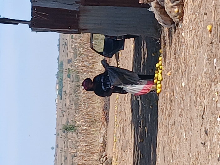 The scene is an outdoor area in Vom, Nigeria, under clear daylight. A lone individual, appearing female, stands slightly bent over in the center-left. She wears a dark top, dark trousers, and a red-patterned head covering. She holds a black plastic bag and a striped fabric bag (red, white, and black sections) in her hands. Numerous spherical yellow fruits are scattered across the dry, reddish-brown earth directly in front of her. To her immediate right, a dark-colored vehicle, possibly a car or SUV, is partially visible with its driver's side door open. Further to the right, a structure made of rusted corrugated metal sheets is present, with indistinct piles of material at its base. The foreground consists of dry, barren earth. The midground features a wide expanse of dry, light-brown vegetation, consistent with mature crops, extending towards the distant horizon. Scattered green foliage is visible within this vegetation. The background comprises rolling hills under a clear blue sky, with a few small, distant structures.