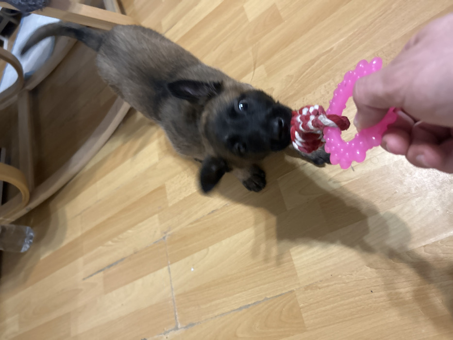 The image depicts an indoor scene in Hrabarsko, Bulgaria, featuring a light-toned wood-laminate floor. A tan and dark-muzzled puppy, consistent with a Belgian Malinois, is positioned in the lower-center to right. The puppy's head is turned towards the viewer, eyes open and alert, and its mouth is engaged with a red and white braided rope toy. This rope toy is attached to a translucent pink, textured, semi-circular plastic chew toy held by a light-skinned human right hand in the foreground, indicating an interactive play session. In the upper right background, parts of a light-colored wooden rocking chair are visible. A clear plastic water bottle rests on the floor in the upper left background. Shadows are cast on the floor to the left of the puppy and the hand.