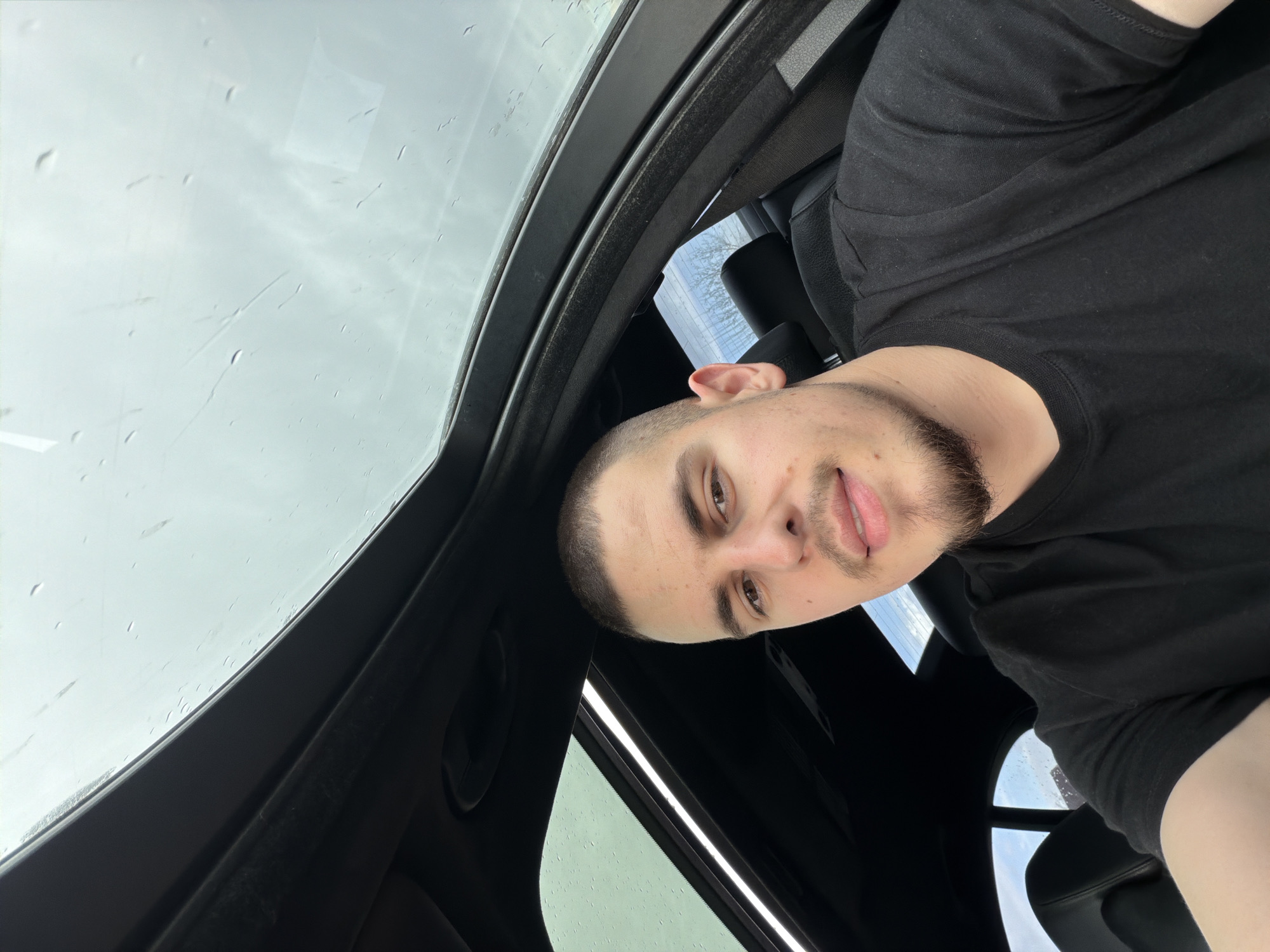 A medium shot shows a man inside a car, possibly a sedan, as indicated by the visible interior and window frame. The car seems to be stationary, with rain droplets visible on the glass roof, suggesting it is raining outside. The man is wearing a black t-shirt. His hair is short and dark, and he has a light beard. The car's interior is predominantly black. The location is unknown. There is nothing to indicate the location being Kadievo, Bulgaria.