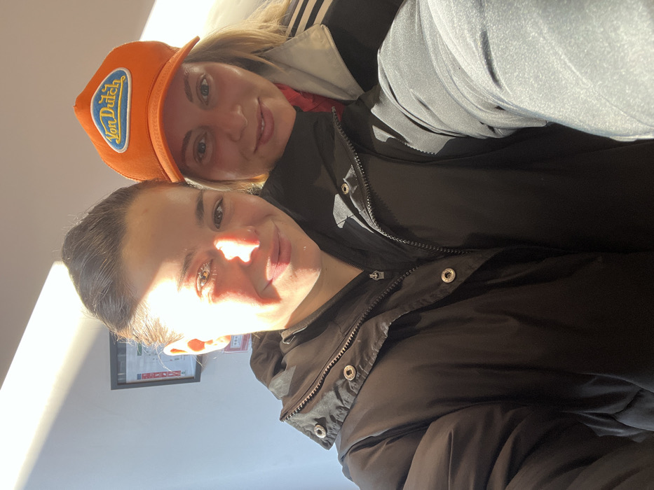 Two adult females are depicted in a selfie photograph taken indoors in the city of Roubaix, France. The specific indoor location within Roubaix is not visually identifiable from the image content. The woman in the foreground, positioned slightly to the left, has dark hair pulled back and wears a black puffer jacket over a black zippered inner garment. Her face is illuminated by direct, strong sunlight from the right, creating pronounced highlights and shadows, and she displays a slight smile. Partially visible behind and to the right of the first woman is a second individual with blonde hair, wearing an orange baseball cap with a blue and yellow "Von Dutch" logo. She is also smiling faintly and appears to be wearing an athletic jacket with white stripes visible on the right shoulder. The background consists of a plain, light-colored wall, with a dark-framed document or sign mounted on it, visible in the upper left quadrant of the image. The scene is brightly lit by the direct sunlight.