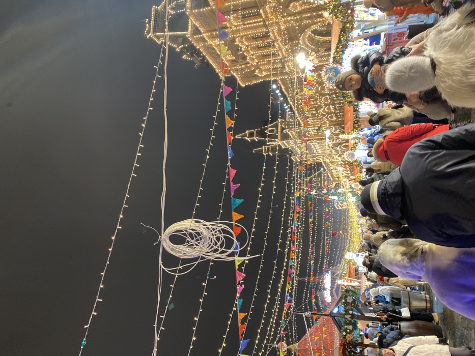A nighttime view of a festive outdoor market. The Red Square in Moscow is illuminated with numerous lights and colorful flags. A large building with many lights is visible in the background. A tangled coil of white cable hangs from one of the light strands. People, bundled in warm clothing, fill the foreground, suggesting a crowded atmosphere. The scene evokes a sense of celebration and the spirit of a holiday market.