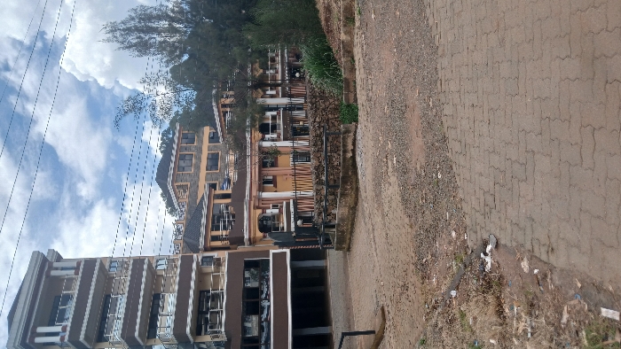 The image depicts an outdoor urban environment within Kisii Central ward, Kenya. The foreground features an uneven, unpaved reddish-brown dirt and gravel area on the left, containing dry vegetation and scattered litter including paper and plastic fragments. A dark, L-shaped metal fixture is partially visible on the far left. To the right, the ground transitions into a grey interlocking concrete paver pathway. In the mid-ground, a low stone wall with a dark metal railing runs horizontally across the frame, acting as a boundary. Behind this wall, a dark vertical pole-like object is visible. The background is dominated by several multi-story buildings beneath a partly cloudy blue sky. The leftmost structure is a tall, approximately five-story building characterized by a brown and light-colored facade, balconies with glass railings, and prominent white architectural columns on its upper levels. The ground floor of this building appears recessed and open, revealing structural pillars. To its right, a complex of multi-story buildings with varied architectural styles is present, including structures with brown/tan facades, white columns, balconies, and dark-framed windows. Further right and higher up, another building with a stone-like facade is visible. Scattered green trees and shrubs are situated behind and to the right of these buildings. Multiple parallel black power lines traverse horizontally across the upper portion of the sky, above the structures. No individuals are present within the scene.
