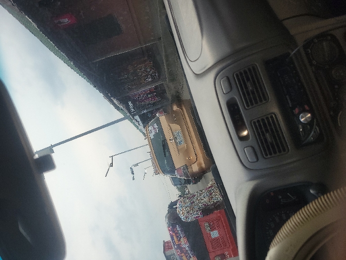 The image depicts a street scene in Uyo, Akwa Ibom State, Nigeria, viewed from the interior of a stationary vehicle