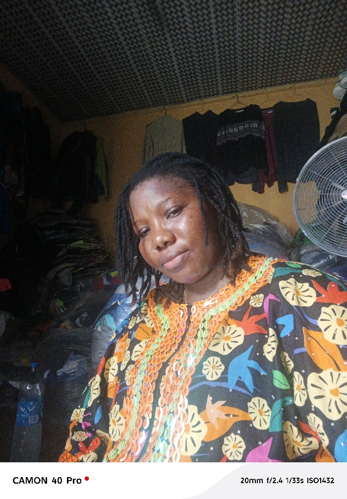 An indoor portrait displays a dark-skinned female individual, centered and looking directly towards the camera. Her hair is styled in short dreadlocks. She wears a brightly patterned garment, possibly a kaftan, featuring a dark base with large yellow, orange, blue, and white floral and leaf motifs. The neckline is adorned with distinct orange and green sequined or beaded embellishments. The subject's face appears slightly shiny, indicative of perspiration. The background suggests an enclosed space, potentially a retail shop or storage area, located in Ado, Nigeria. To the left of the subject, stacks of what appear to be folded garments or fabric are visible, along with a transparent plastic water bottle containing liquid and a blue label. To the right, a silver-colored oscillating fan with a white protective grill is positioned. Multiple garments, including sweaters and jackets, are hanging on hooks or a rail against a light brown wall. The ceiling features dark, patterned acoustic tiles. The overall lighting is somewhat dim.