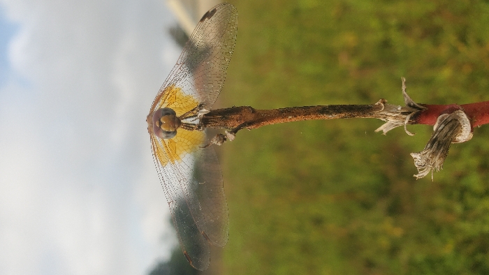 A dragonfly rests on a twig, oriented horizontally in the frame. The dragonfly's body is yellow and the wings are transparent with some yellow markings. The twig is brown, appearing dried out, with the right end showing some frayed remnants. The background includes green vegetation and a glimpse of a cloudy sky. The image is shot at close range, emphasizing the dragonfly's details.