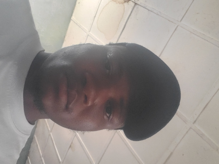 The image displays a headshot-style portrait of a single dark-skinned male individual, approximately 20-30 years of age, depicted from the chest up