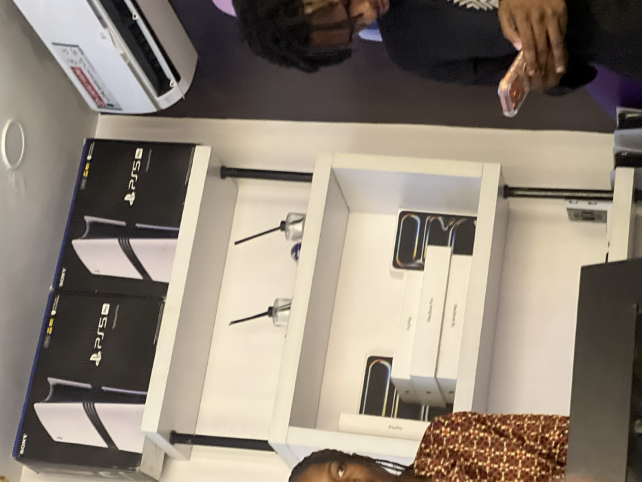 The image displays an indoor retail or office environment in Ikeja, Nigeria. Two Sony PlayStation 5 console boxes are positioned on the top shelf of a white shelving unit. Below them, two glass diffusers with black reeds are visible. The next shelf down holds multiple white boxes, including one clearly labeled "MacBook Pro" and others consistent with iPhone 14 Pro Max packaging. A white split-unit air conditioner is mounted on a dark-colored wall to the right. A female individual, partially visible on the left, wears a brown patterned shirt. A male individual, partially visible on the right, wears a dark long-sleeved shirt, glasses, and has dreadlocks; he is looking down at a light-colored smartphone held in both hands. A dark surface, possibly a desk or counter, occupies the foreground.