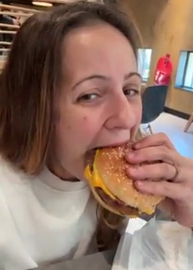 A medium shot depicts a woman indoors taking a large bite out of a hamburger