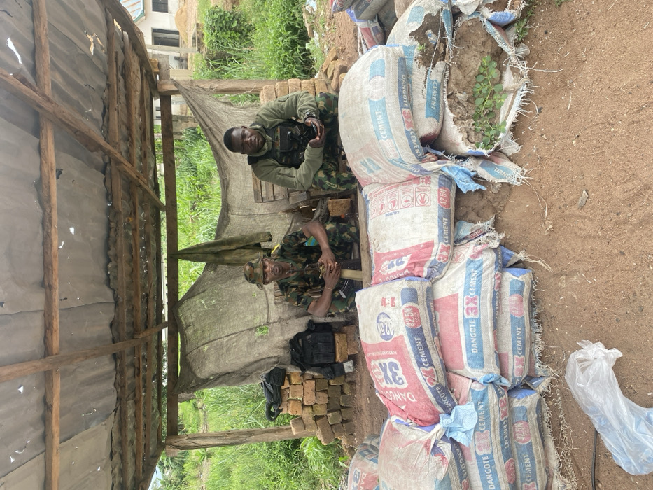 The image depicts an outdoor, rudimentary security checkpoint or observation post in Wukari, Nigeria. **Scene Description:** The focal point is a makeshift shelter constructed from rough wooden poles supporting a corrugated metal sheet roof, which shows signs of wear and multiple perforations. The rear and left sides of the shelter are partially enclosed with a dark, possibly camouflaged, netting or fabric material. **Personnel:** Two adult males, presumed to be military personnel, are seated within the shelter. 1. **Left Individual:** Wears a full camouflage uniform, including a boonie hat. He is seated on a low wooden surface, holding a dark, elongated object (possibly a rifle) pointed downwards between his legs. A black tactical vest and a black backpack are positioned on the ground to his immediate left, adjacent to a stack of red bricks. 2. **Right Individual:** Wears an olive-green long-sleeved shirt and camouflage trousers, equipped with a dark tactical vest featuring pouches. He is seated on a wooden bench, holding a dark-colored smartphone in both hands. Both individuals are looking forward towards the camera. **Barricade and Objects:** In the immediate foreground, a low defensive barricade is formed by multiple stacked bags of "DANGOTE 3X CEMENT 42.5N". These bags are filled, likely with sand or earth, and some exhibit damage, with their contents exposed and minor plant growth visible on top and from tears. A discarded clear plastic bag lies on the bare earth in the lower-left foreground. **Environment:** The ground surrounding the shelter is bare, reddish-brown earth. Beyond the shelter, extensive lush green vegetation, including tall grasses and trees, is prominent. In the distant right background, several concrete buildings are partially visible amongst the foliage. The scene is illuminated by natural daylight.