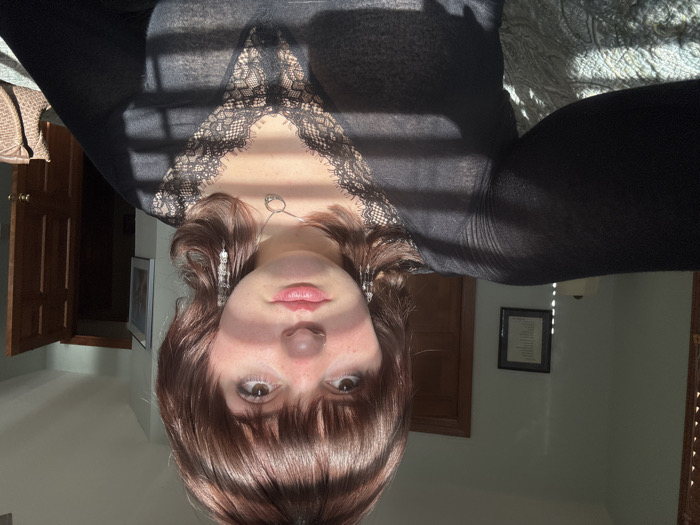 An upside-down view of a fair-skinned woman with bangs and shoulder-length brown hair. She wears a black top with lace trim at the neckline and a delicate necklace. Sunlight casts shadows across her face and clothing. A partially open wooden door and framed picture are visible in the background, along with a glimpse of a patterned bed covering. The room appears to be a bedroom or living space.