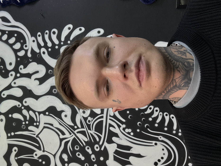 The image displays an adult male in a headshot-style portrait, positioned indoors against a black wall featuring a distinctive white abstract mural. This mural, characterized by interconnected organic shapes, swirling lines, and various sized dots, identifies the location as Faux Pas Tattoo in Moscow, Russia. The male subject has fair skin, light brown hair styled to his right, and faint stubble on his jawline. He possesses two prominent tattoos: a small black anchor on his upper left cheek and an extensive blackwork depiction of a ram or bighorn sheep skull covering his entire neck. He wears a black ribbed sweater over a grey crew-neck t-shirt, with a thin silver-colored chain visible around his neck. The subject maintains a neutral expression while looking directly at the camera. A small, blue, textured object is partially visible on the far right edge of the frame.