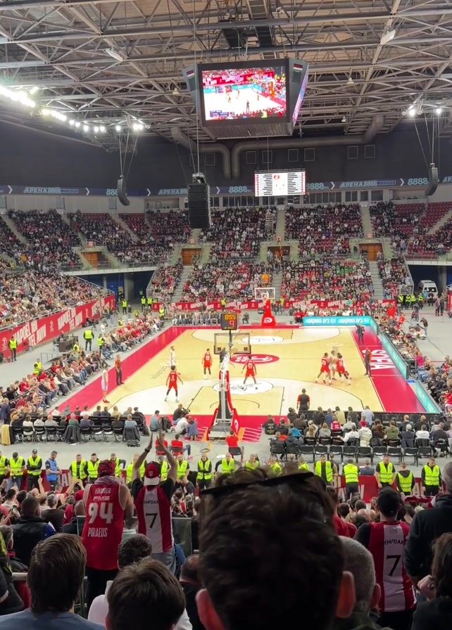 basketball game in a packed indoor arena. The court is red, and the teams are wearing red and white uniforms. The players are actively engaged in the game, moving the ball and attempting shots. The audience, mostly dressed in red, fills the stands. Many people are cheering and waving their arms in support of their team. A large screen hangs above the court, displaying the game in progress. The arena has a high, industrial ceiling. The video is taken from a spectator's perspective, slightly obstructed by the heads of people in the foreground.
