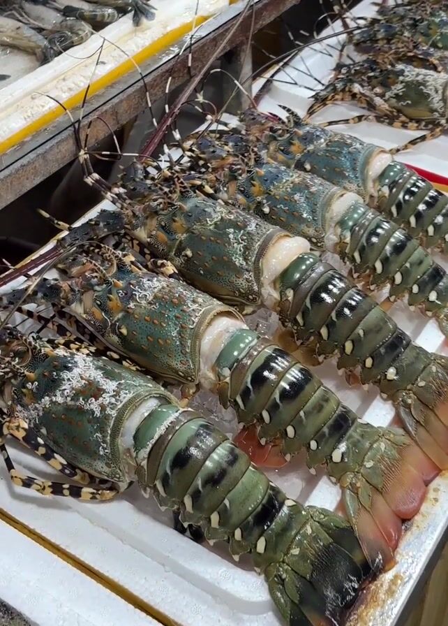 display of fresh seafood, likely at a market. Several large lobsters, exhibiting green and brown coloration with striped segments, are arranged on a white surface, likely ice. Other varieties of shrimp or prawns are visible in trays in the background, along with what appears to be a weighing scale. The scene suggests a market setting where fresh seafood is being sold.