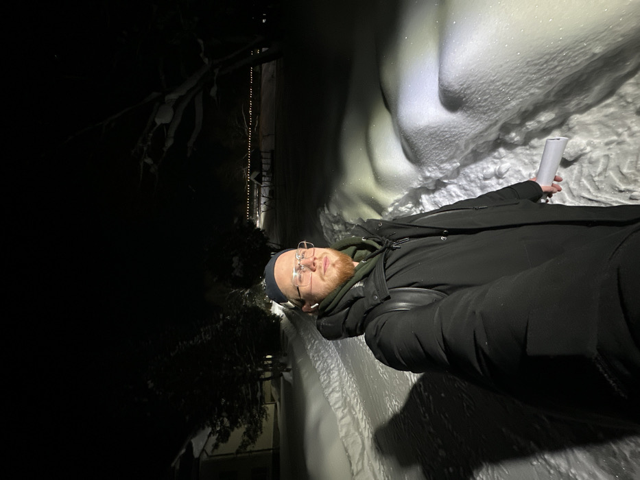 A man with a beard, wearing glasses and a dark coat, lies on a snow-covered surface. He holds a white object in his right hand. The background is dark, with trees on the left and a snowdrift illuminated by a light source on the right. Some dim lights are visible in the distance along a structure. The image appears to be taken at night.