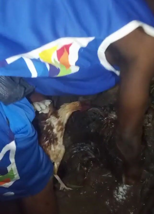 A person in a blue shirt appears to slaughter a chicken by cutting its throat