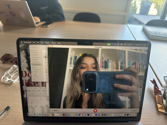 A laptop displays a Photo Booth application showing a reflection of a young woman holding a phone