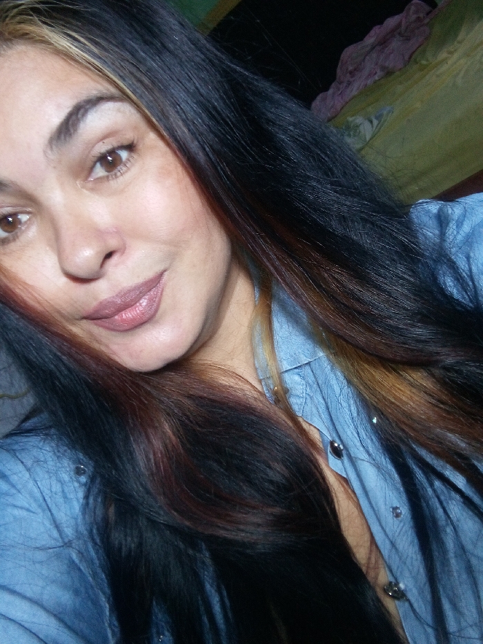 A woman poses in a selfie. She has dark hair with auburn and blonde highlights, light brown eyes, and wears light pink lipstick. Her blue denim shirt is partially unbuttoned. A bed is visible in the background. The lighting is soft, emphasizing her features. Her expression is neutral, and she is looking directly at the camera.