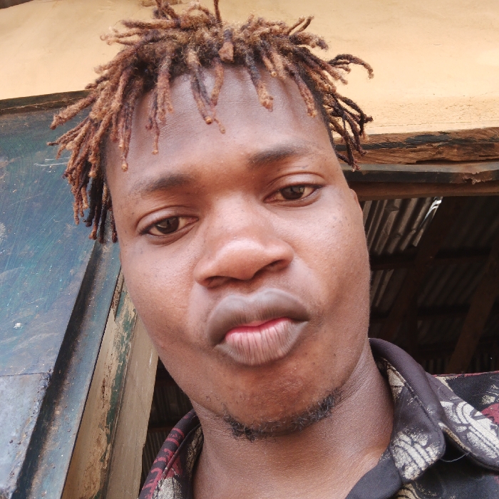 A close-up photo captures a person with brown skin, dreadlocks with light brown tips, and a trimmed goatee. They are wearing a black patterned shirt. The background shows a light brown wall with a blue frame. Part of a wooden structure with a corrugated metal roof is also visible. The person's expression suggests they might be pouting or making a kissing face.