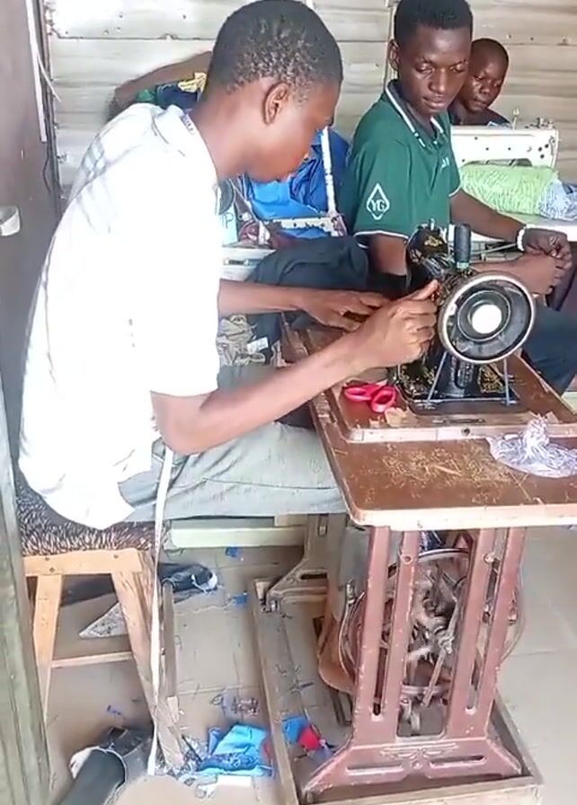 three men working at sewing machines in what appears to be a small tailoring shop