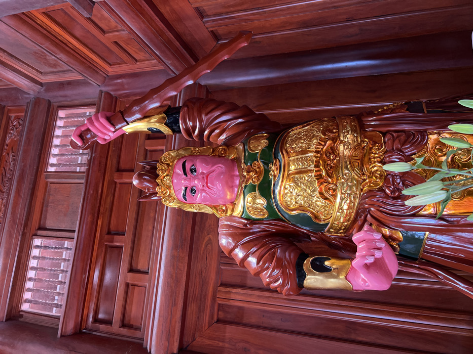 A wooden sculpture of a deity, possibly from Asian religious traditions, dominates the frame. The figure, painted with a vibrant pink face, gold embellishments, and dark green accents, is clad in armor. It holds a long, wooden weapon. The sculpture is mounted against a dark reddish-brown wooden wall, featuring ornate carvings and a paneled design, which creates a textured backdrop. The lighting and angle suggest a low perspective.
