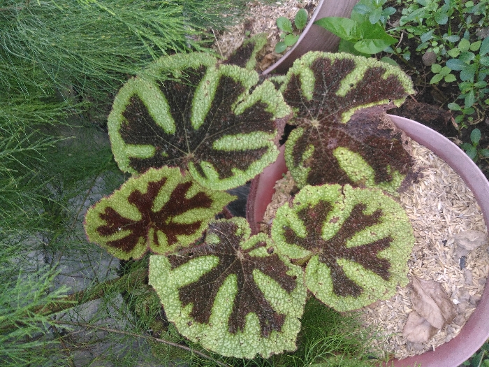 The image displays a close-up of a variegated plant with large, rounded to cordate leaves, each exhibiting a distinct pattern of light green and dark brown. The dark brown pigmentation forms an irregular star-like or radial design originating from the center of each leaf, contrasting with the light green, textured periphery. The plant is housed in a circular, reddish-brown pot, filled with a light brown, granular material, likely wood chips or rice hulls, upon which a single dried, curled brown leaf rests. In the upper portion of the background, dense, fine-leaved green foliage is present, obscuring a light grey concrete or stone surface. The lower right foreground reveals dark soil with scattered small green ground cover plants and a partial view of the rim of a second reddish-brown pot. No discernible features are present within the image to specify a location within the city of El Nayar, Mexico. No individuals are visible.