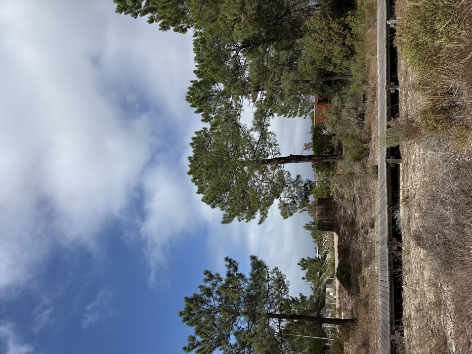 The image displays an outdoor environment in Grândola, Portugal, under a partly cloudy sky. The foreground features a weathered wooden boardwalk running horizontally across the lower third, constructed from parallel planks. The ground immediately surrounding the boardwalk is dry, light brown soil with sparse, low-lying scrub and dry grass. Numerous tall pine trees with dark green needles dominate the midground and background. In the mid-distance, a cylindrical structure approximately one meter high, composed of vertical wooden stakes, is situated on a slightly elevated area. Beyond this, scattered among the trees, various man-made structures are visible. To the left, a light-colored building is partially obscured by a wire fence. To the right, a rectangular structure with a reddish-brown, possibly metal or wood, exterior is nestled within the dense tree line. A tall, pale-colored construction crane is faintly discernible in the far right background, extending above the treeline. The sky in the upper portion of the image is blue with significant white stratocumulus clouds, particularly dense on the right side. No individuals or animals are present, and no actions or interactions are depicted.
