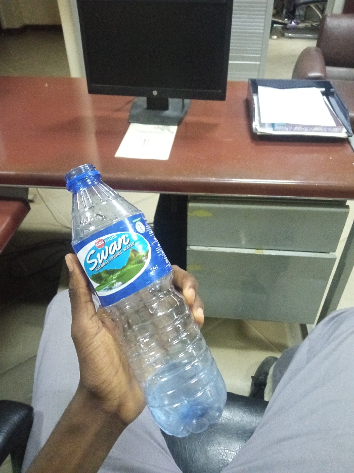 The image presents an indoor office scene in Kakuri Gwari, Nigeria, viewed from a seated individual's perspective. In the foreground, a dark-skinned right hand holds an uncapped 75cl plastic bottle of "UGC FOODS Swan Natural Spring Water," which is partially consumed. The person's light grey trousers are visible, along with a dark shoe resting on a dark office chair. A brown wooden desk occupies the mid-ground, featuring a black flat-screen computer monitor, likely an HP model, which appears to be off or displaying a black screen. A white document is situated beneath the monitor stand. To the right of the monitor, a dark paper tray contains multiple documents. Below the desk, a grey two-drawer filing cabinet is visible. The background reveals a light-colored tiled floor and a brown upholstered chair, consistent with an office environment.