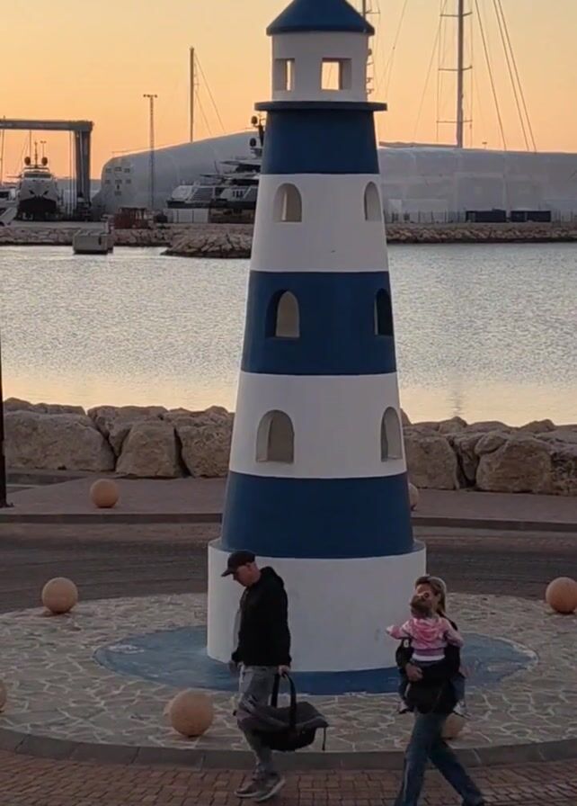 . A family of three walks around a blue and white model lighthouse on a paved plaza near a harbor. The sky has sunset colors. The mother carries a baby in a carrier on her front. The father walks a few steps ahead, carrying a bag. The lighthouse sits on a circular platform. The harbor has many boats in the background. A breakwater of large rocks runs behind the lighthouse.