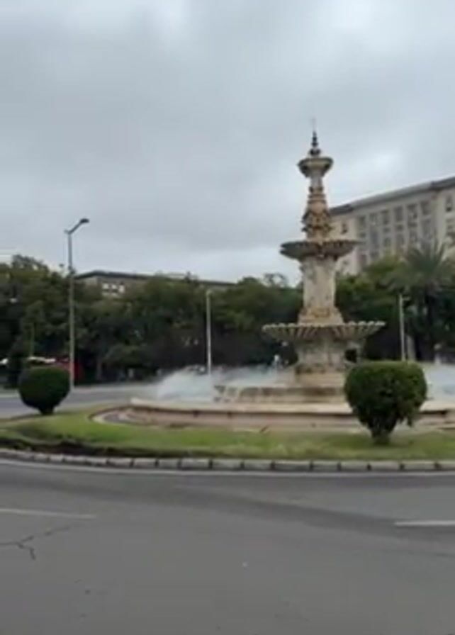 n overcast day with a roundabout in the foreground. A fountain is centered in the roundabout, with water flowing from it. Beyond the roundabout, trees line the street, and there are buildings in the distance. A horse-drawn carriage is driving left on the street toward the camera, and a red and gray articulated bus is traveling away from the camera on the right of the street. The camera appears to be mounted on a bicycle.