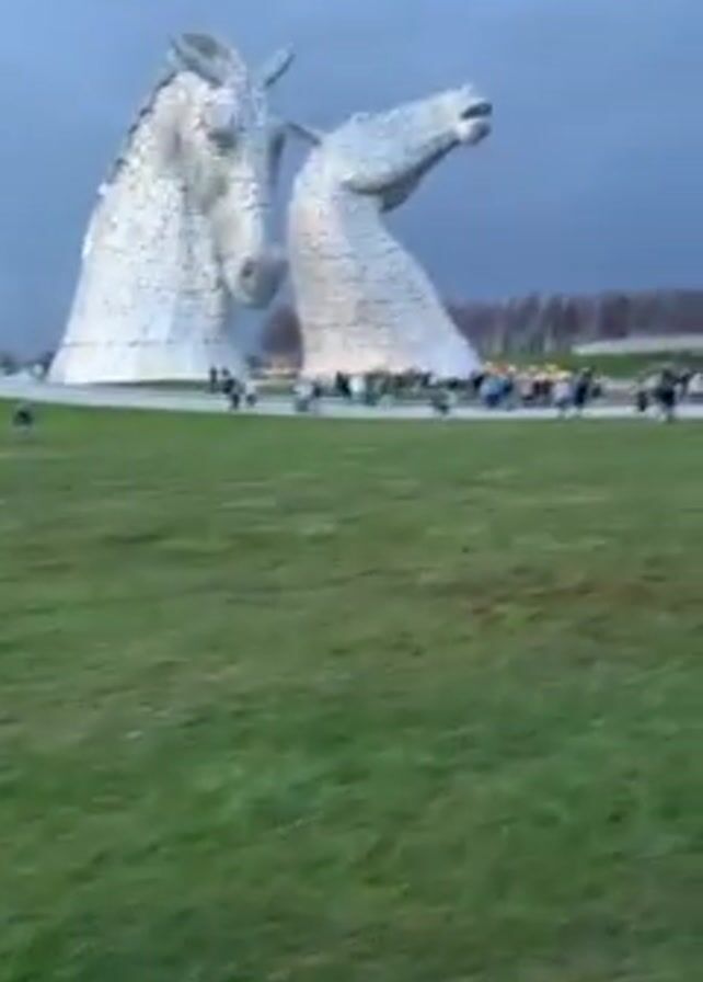 large outdoor art installation featuring two giant horse heads made of metal. People are walking around the area, some are near the sculptures, and others are walking towards a nearby cafe building. The ground is covered in green grass and patterned pavement. The sky is overcast.