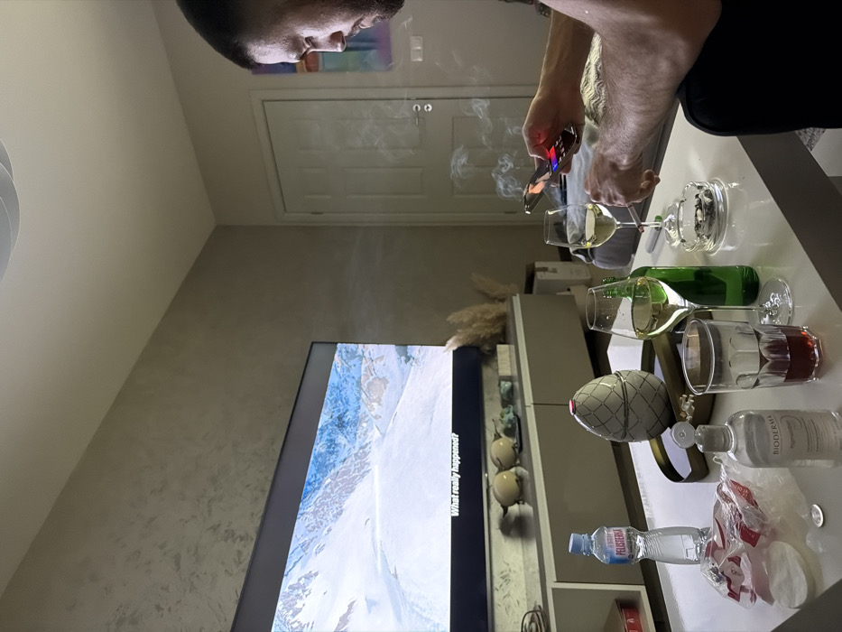 The image portrays an indoor domestic setting, identified as a living room in the city of Lozenets, Bulgaria. A male individual, visible in profile from the mid-torso up on the right, has short dark hair and a beard. He is seated on what appears to be a light-colored sofa, holding a dark-colored flip phone with illuminated keys in his left hand and a lit cigarette, from which smoke emanates, in his right hand. In the background, a large flat-screen television displays a snowy mountain landscape with the overlaid text "What really happened?" The television rests on a long, low media console with light-colored drawers and a dark top surface, adorned with decorative items including dried pampas grass and two spherical objects. A white rectangular coffee table occupies the foreground. On it are a plastic bottle of "PELISTERKA" mineral water, an egg-shaped diffuser with a red light, a gold-colored tray, two wine glasses containing white wine, an empty green beer bottle, a clear glass holding a red beverage, a clear glass ashtray filled with cigarette butts, a bottle of "BIODERMA" micellar water, a red plastic bag containing cotton pads, and a loose coin. The room features light gray walls with a textured finish and a plain white ceiling. A closed white door with a silver handle is visible in the far-right background, adjacent to a framed abstract artwork.