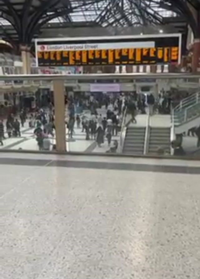 busy train station, likely in London given the sign that says "London Liverpool Street"