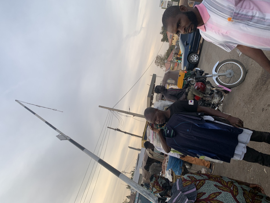 A bustling street scene features several individuals. Two men stand in the foreground, one in a pink and white striped shirt and another holding a stack of clothes. In the background, a motorcyclist and other people are visible, along with a yellow vehicle. A railroad crossing gate stands tall on the left, and power lines stretch across the sky. The overcast sky suggests early morning or late afternoon.