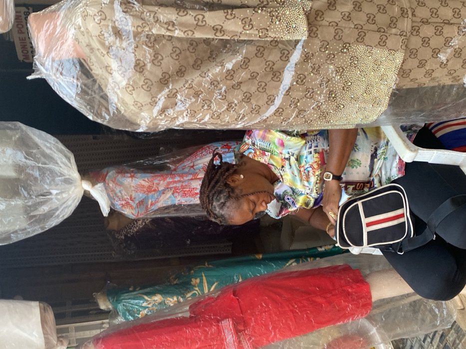 The image displays rolls of wrapped fabrics, including some with prints like a Gucci-inspired pattern and coral designs. A woman with braided hair, wearing a colorful patterned shirt, sits amidst the fabric rolls. She wears a watch and a ring, and has a black, white, and red striped bag resting on her lap. The background suggests a store or storage area. A “MONIE POINT” sign is also visible.