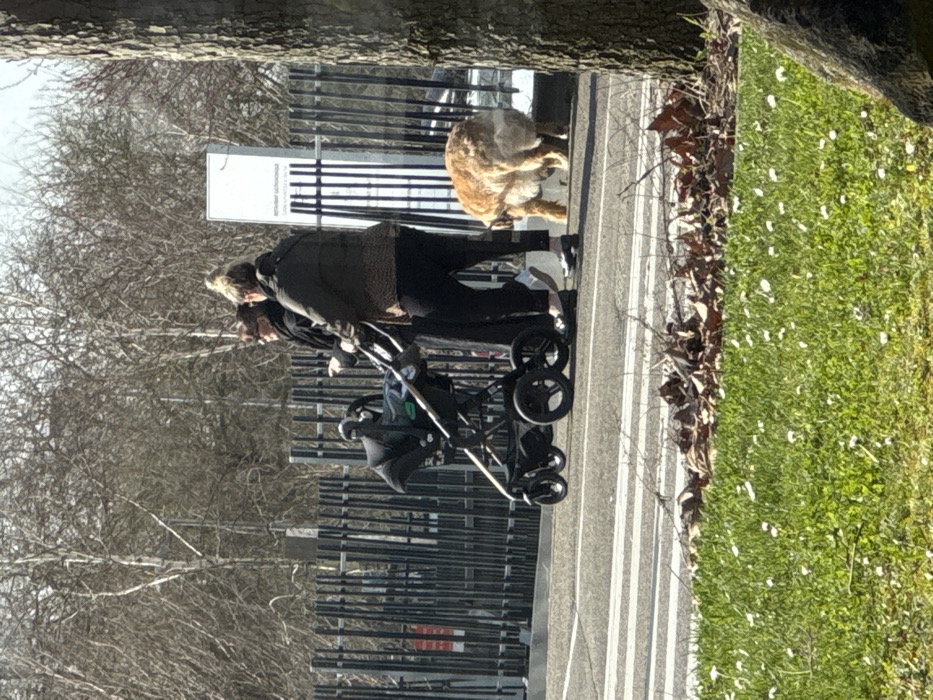 An outdoor scene in Oberhausbergen, France, depicts two adult females walking right-to-left on an asphalt surface. The woman on the left wears dark clothing and sunglasses, holding a dark object in her right hand. The woman on the right, with light hair in a bun, wears a dark puffer jacket with a leopard print pattern and dark trousers; she is pushing a dark-colored stroller containing a car seat. A large, light brown dog is positioned behind the second woman, facing away from the viewer, appearing to urinate or defecate near the edge of the asphalt. In the foreground, a grassy area features small white flowers and scattered dry leaves. A tree trunk is partially visible on the far right. The background consists of a dark metal fence, behind which are numerous bare-branched trees and a white rectangular sign displaying faint text, including "RESTAURANT GASTRONOMIQUE." The scene is brightly lit by natural sunlight.