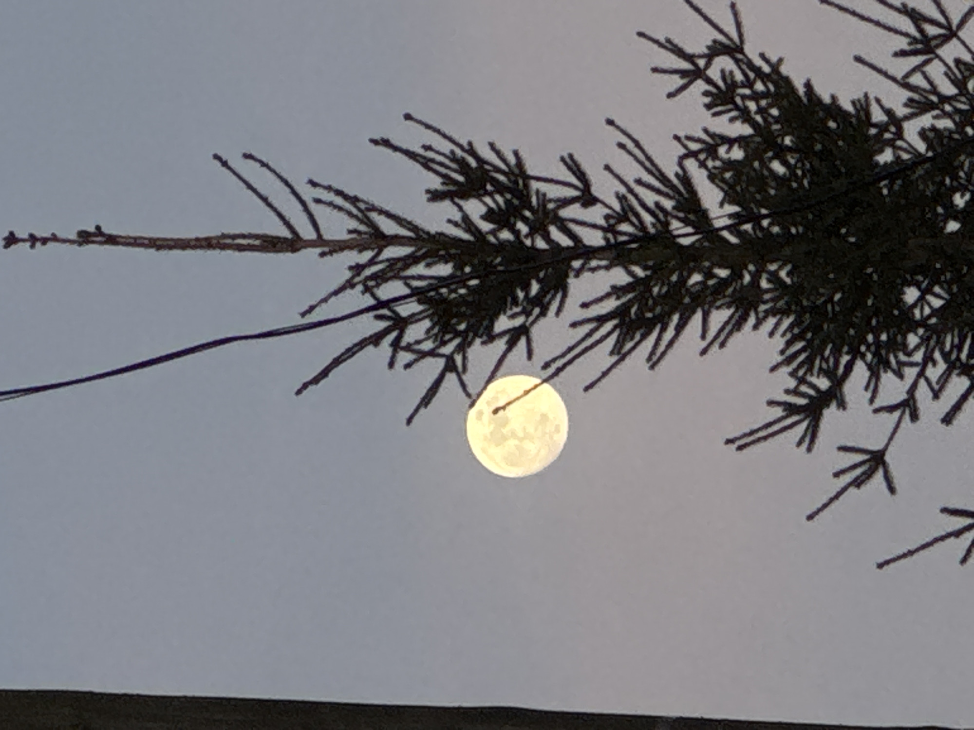 full moon in the sky. The moon is positioned centrally, with tree branches partially obscuring it on the right and top. The sky is a pale, overcast grey. A dark, indeterminate object is in the lower foreground. A single thin dark cable spans the upper left of the frame. The location, Chaikovsky, Russia, is based on inference as there are no defining characteristics within the image itself.