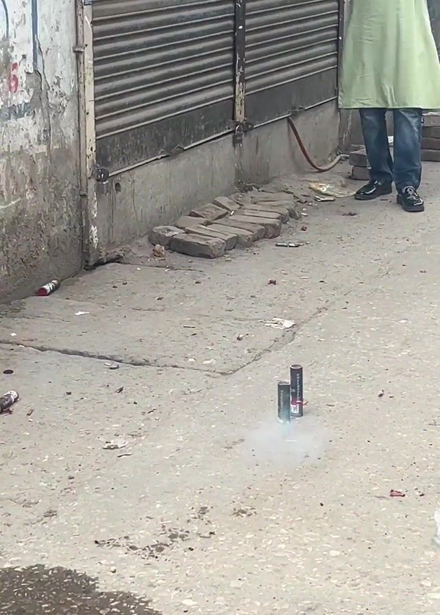 fireworks being ignited on a street next to a wall with graffiti. A man in a green garment stands nearby talking on his phone. As the firework goes off, a large orange flame and cloud of white smoke are released into the air. The camera pans up to show the smoke dissipating near a tall apartment building. The camera then pans back down to show the firework still emitting smoke with the man on the phone still nearby, before the video ends.