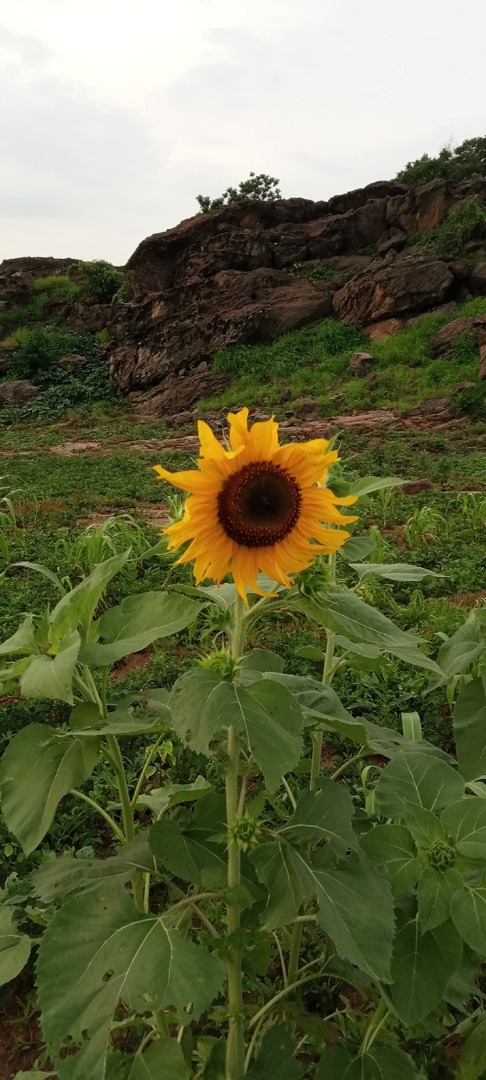 The scene, set in Girei, Nigeria, displays a prominent, fully bloomed sunflower positioned centrally in the foreground. The sunflower exhibits vibrant yellow ray florets surrounding a dark brown, circular disc floret head. Its thick green stem supports several large, ovate green leaves, some showing evidence of insect consumption through irregular holes. Multiple smaller, unbloomed sunflower buds are visible on the lower stem. The immediate ground consists of dense green vegetation, likely a mix of cultivated plants and wild growth, with interspersed patches of reddish-brown soil. In the distant background, a rocky incline features dark brown, stratified rock formations partially covered by sparse green foliage. The sky above is uniformly light grey, indicating overcast conditions. No people or animals are present.